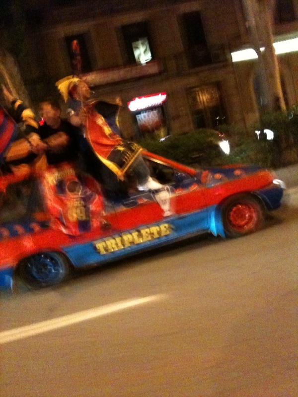 Na de nodige toespraken van de reeds beschonken spelers en nog een aantal bekenden gesproken te hebben, hebben we het stadion verlaten. Buiten nog een FC Barcelona vlag gekocht die Monique om haar nek zou binden voor achterop de scooter. Met een oververhitte toeter zijn wij vervolgens over de Gran Via tussen de honderden auto´s en duizenden uitgelaten fans naar huis gereden. Onderweg hebben wij gelukkig niks meegekregen van de kleine relletjes die zijn uitgebroken.