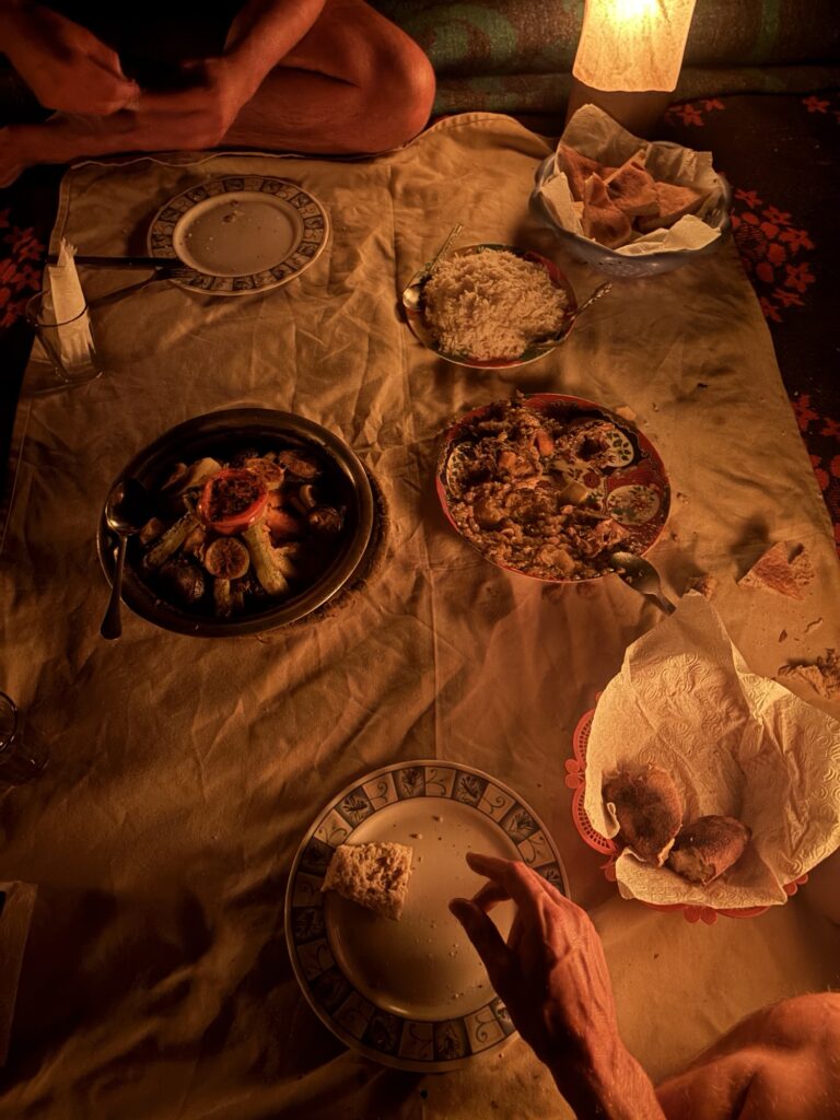 Toen we gisteravond lang uit lagen te genieten moest het eten nog opgediend worden en dat was ook fantastisch. Tajine met groentes en een stoof van kip met vers gebakken brood en rijst waren in en onder het open vuur bereid en smaakte voortreffelijk. Het was ruim na tien uur toen we de laatste hap namen en we voldaan naar een hemel vol sterren keken.