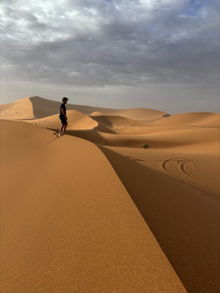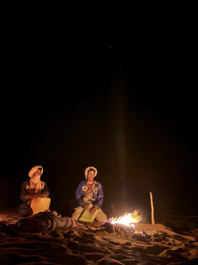 Na wat filosofische uitwisselingen dachten Co en ik te kunnen gaan slapen maar toen kwamen onze gidsen met een jerrycan en de deksel van de koelbox de tent uit. Deze geïmproviseerde trommels zorgden voor de ritmische ondersteuning van verschillende soorten berbermuziek. Meegevoerd in de muzikale stemming werden spotify playlists tevoorschijn gehaald en maakten onze gidsen kennis met de Golden Earring.