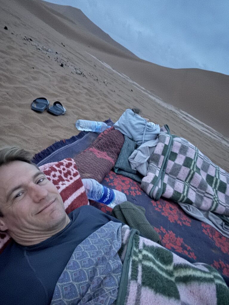 Het was uiteindelijk bijna middernacht toen we onder de sterrenhemel onze dekens over ons heen trokken en in slaap vielen. Dat in slaap vallen zouden we nog wel vaker doen gedurende de nacht, de wind trok aan, zand overal en bewolking voor de sterren. Maar elke keer als ik weer even wakker werd, genoot ik van de unieke situatie.