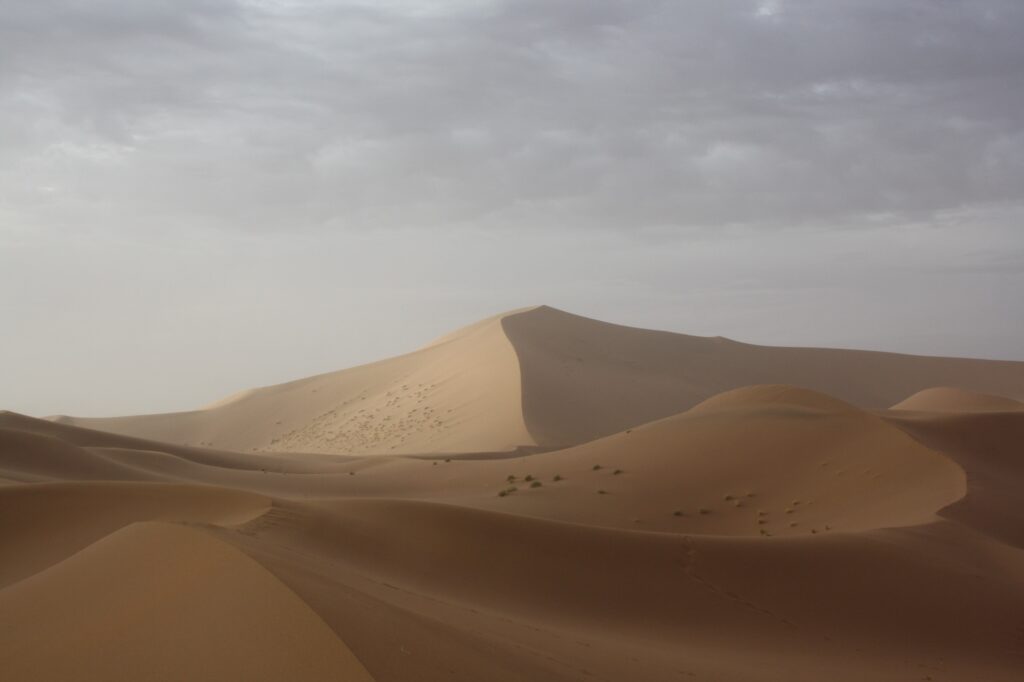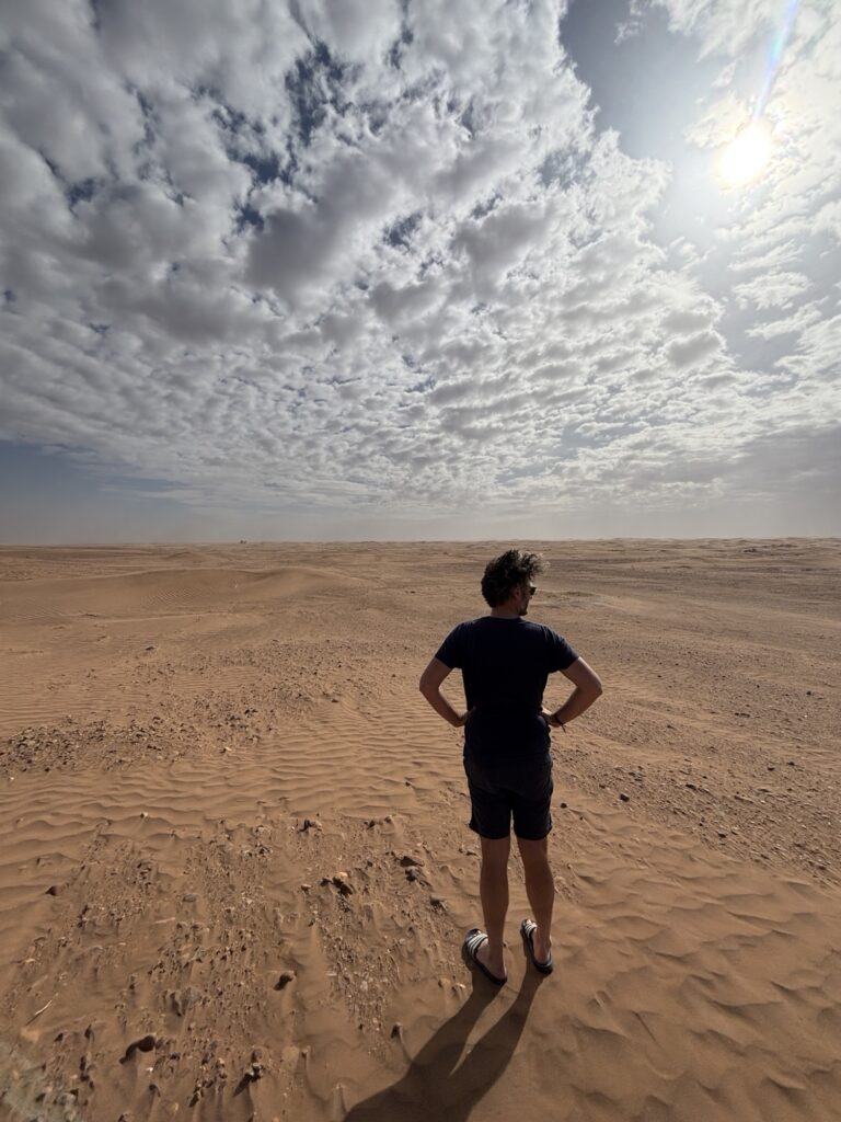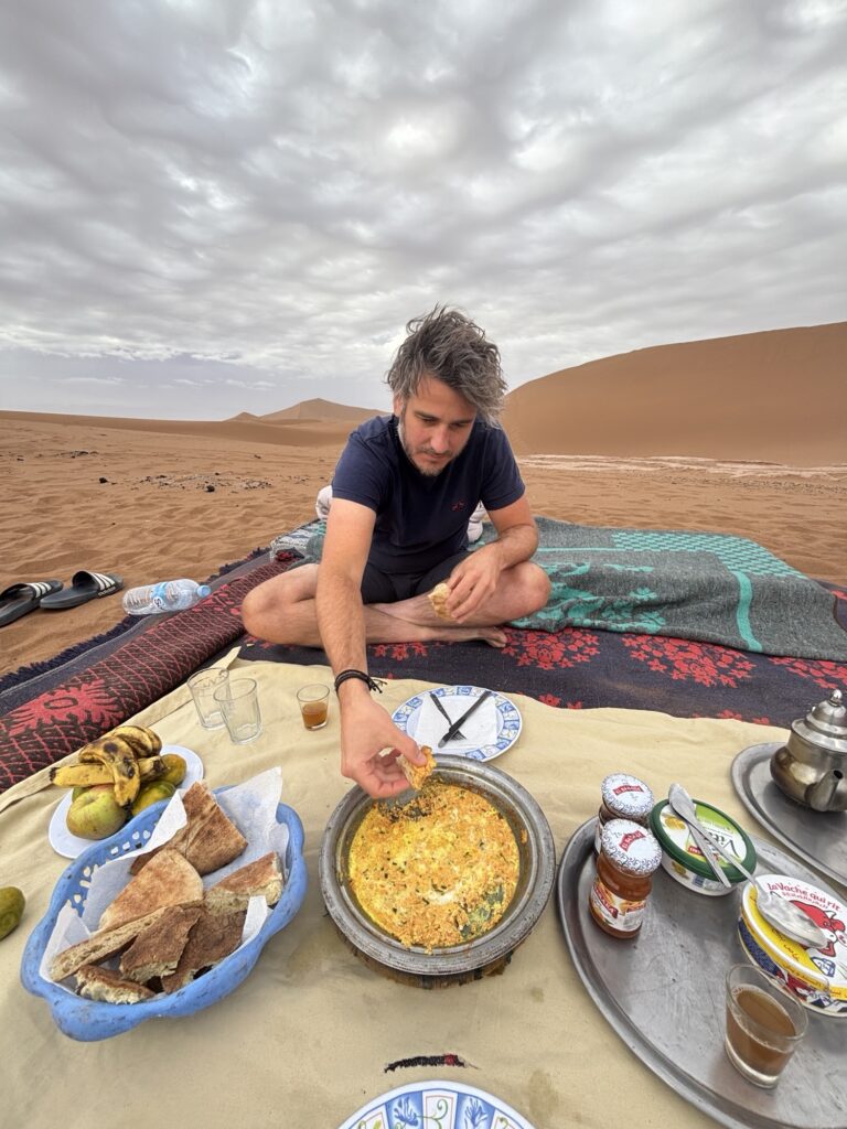 Iets na zeven uur werd duidelijk dat de bewolking een spectaculaire zonsopkomst verhinderde, het diffuse licht bracht echter een evenzo bijzonder aanzicht van de zandduinen. Het ontbijt werd daarna opgediend en de wind zorgde voor extra bite in de omelet, volgens goed bedoeïenen gebruik spoelde we het zand weg met thee.