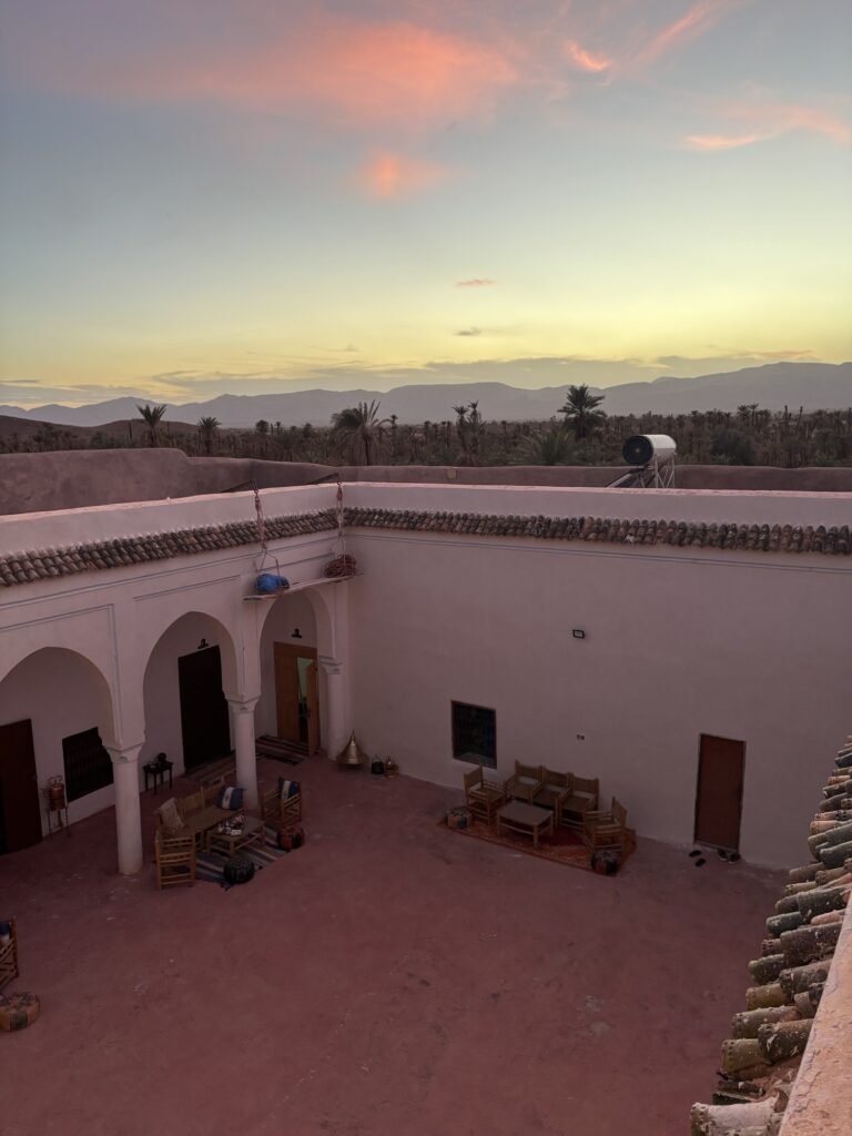 Na de korte nacht en de lange rit checken we voldaan in en genieten van de warme douche. Vandaag is vrijdag en vrijdag is couscousdag en die wordt op de binnenplaats van de riad opgediend en smaakt heerlijk. Vanavond geen muzikaal dessert maar tijdig onder de wol.