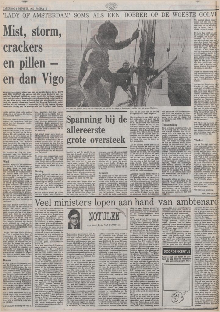 Vandaag een nieuw reisverslag van de Amsterdamse leraar BERT VAN DER WOERDT, die samen met zijn vrouw Marianne een reis naar het Caraïbisch gebied (en terug) maakt. Het echtpaar maakt de toch met de Lady of Amsterdam, een sloepgetuigd stalen jacht (en niet een Waar schip, zoals wij de vorige keer abusievelijk vermeldden). Het eerste reisverslag (vanuit het Engelse Falmouth) publiceerden wij op zaterdag 3 september in PS. De tweede bijdrage bevat een verslag van de woelige reis van Engeland naar Spanje.