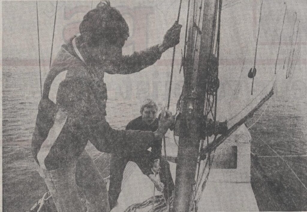 Opeens, wind! Uit het noordoosten nog wel. De mist waait weg en we gaan terug op onze oude koers. Nu kruisen we de route dan toch echt. De wind neemt toe en binnen twee uur moet de stormfok erop en het grootzeil dichtgereefd (oppervlak verkleind tot ongeveer 16 vierkante meter). De golven lopen hoog op en alleen op de toppen kunnen we goed uitkijken. En dan zijn ze er. Hoog en angstaanjagend tegen de loodgrijze lucht: Drie messcherpe voorstevens met bijpassende schuimsnorren. In grimmige eenheid komen ze naast elkaar op ons af. De eerste twee gaan net achter ons om, de derde en kleinste jaagt door, duidelijk op ramkoers.